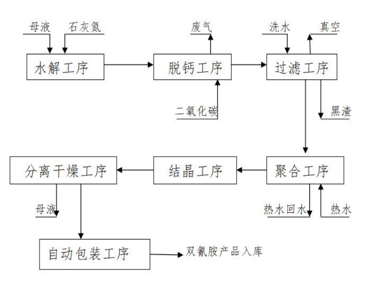 將水或母液打入攪拌罐,經石灰氮磨細后定量均勻地加入配漿槽充分攪拌,使石灰氮完全水解,生成氰胺氰鈣液,再將水解液經泥漿泵送入碳化塔,與來自石灰窯的經過壓縮后進入碳化塔的二氧化碳氣體(窯氣)完全接觸反應,完成石灰氮水溶液的脫鈣過程。將水解脫鈣反應完成后的料液加入帶濾機,將石灰氮中水解碳化的雜質以及碳化過程中生成的碳酸鈣固體濾掉,得到純凈的單氰胺溶液;將單氰胺水溶液打入聚合鍋,經蒸汽加熱至 70℃,并調整 PH 值為 10 左右,完成聚合過程,生成雙氰胺。再將雙氰胺水溶液放入抽濾桶,過濾掉聚合過程中生成的白灰等雜質,再經硅藻土過濾機過濾得到純凈的雙氰胺溶液;將純凈的雙氰胺溶液打入結晶鍋,通過冷凍站來的低溫水雙氰胺水溶液進行降溫、結晶,在溶液中析出雙氰胺固體;將結晶鍋中的溶液放出,經抽濾桶過濾,其中雙氰胺晶體經離心機甩干,再經流化床干燥機干燥,得到雙氰胺成品;將濾掉的雙氰胺母液送入配漿槽作為石灰氮水解用,完成工藝系統的密閉循環。