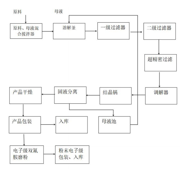 將母液或軟化水打入投料攪拌器,按照比例投入雙氰胺,經(jīng)泵打入溶解釜,升溫充分溶解后,放入溶解液儲罐后經(jīng)泵打入一級過濾器,過濾液進入一級濾液儲罐,再經(jīng)泵打入二級過濾器,進行精密過濾,濾液經(jīng)精密過濾器出口再經(jīng)超精密過濾器打入結(jié)晶鍋中結(jié)晶,冷卻結(jié)晶后由結(jié)晶鍋放出,經(jīng)離心機進行固液分離,分離后的濕結(jié)晶體經(jīng)螺旋機送入燥機干燥,干燥后的成品,稱量、包裝。